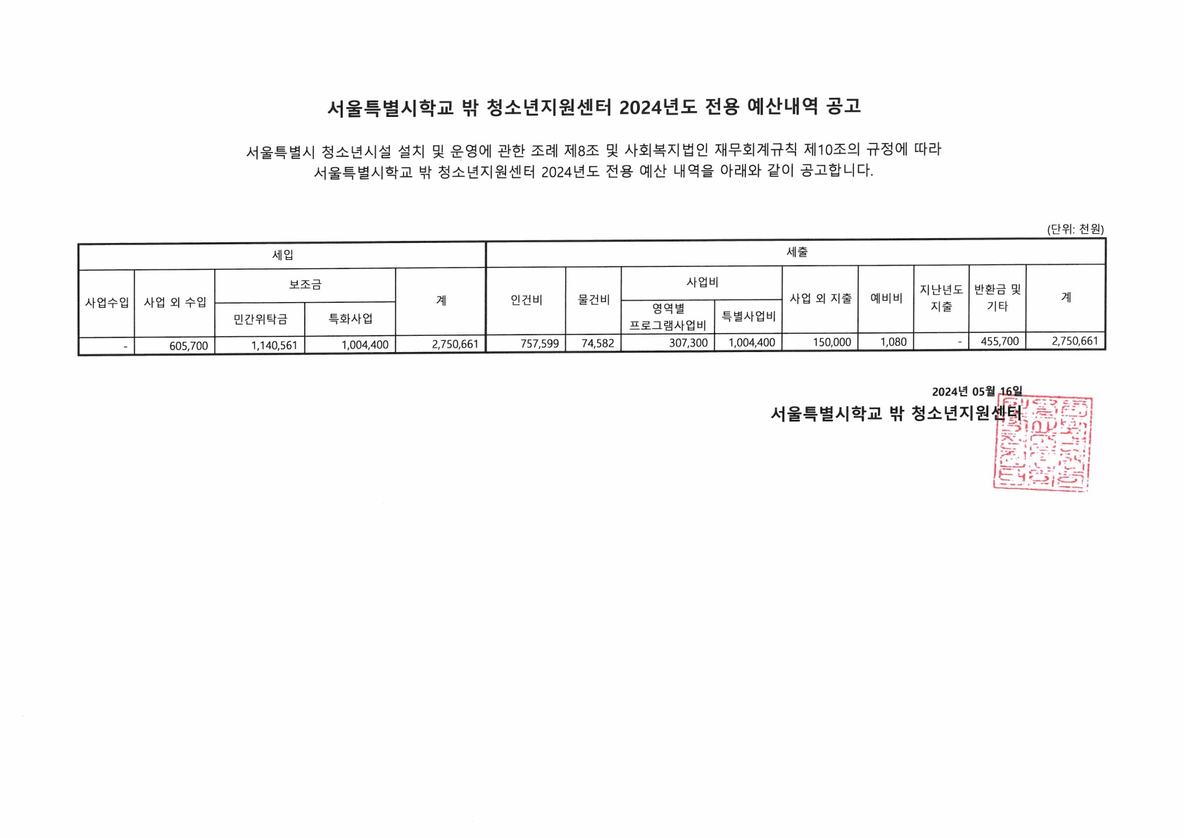 서울특별시학교밖청소년지원센터 2024년 전용 예산내역 공고