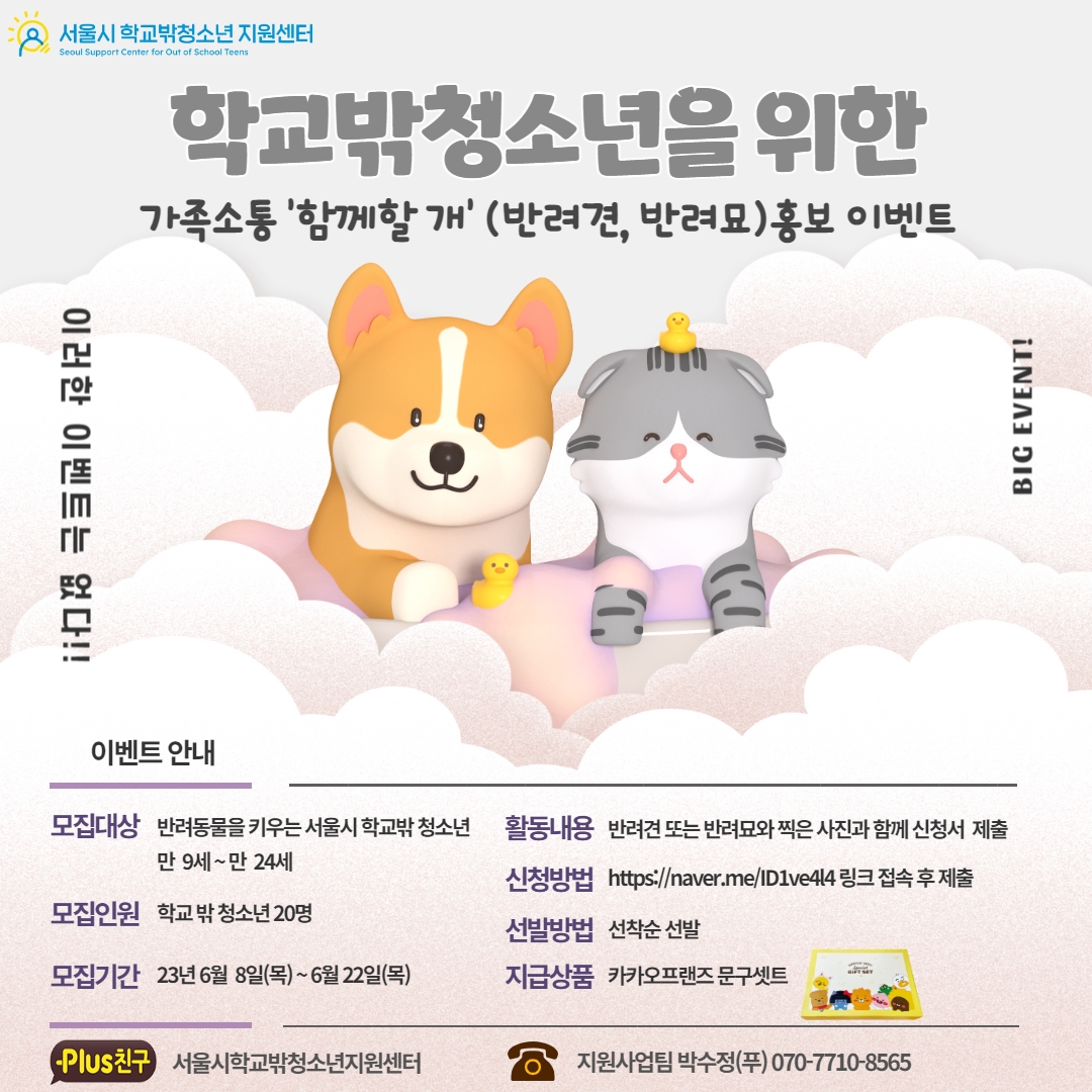 1. 개인정보의 이용 목적 : 학교 밖 청소년 지원 서비스 안내, 사업실적보고, 만족도조사
