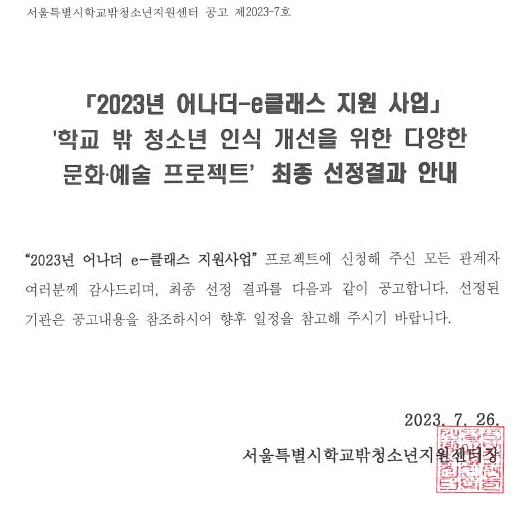 첨부파일 2023년 어나더 e-클래스지원사업 학교 밖 청소년 인식 개선을 위한 다양한 문화 예술 프로젝트 최종 선정 공고문.hwp