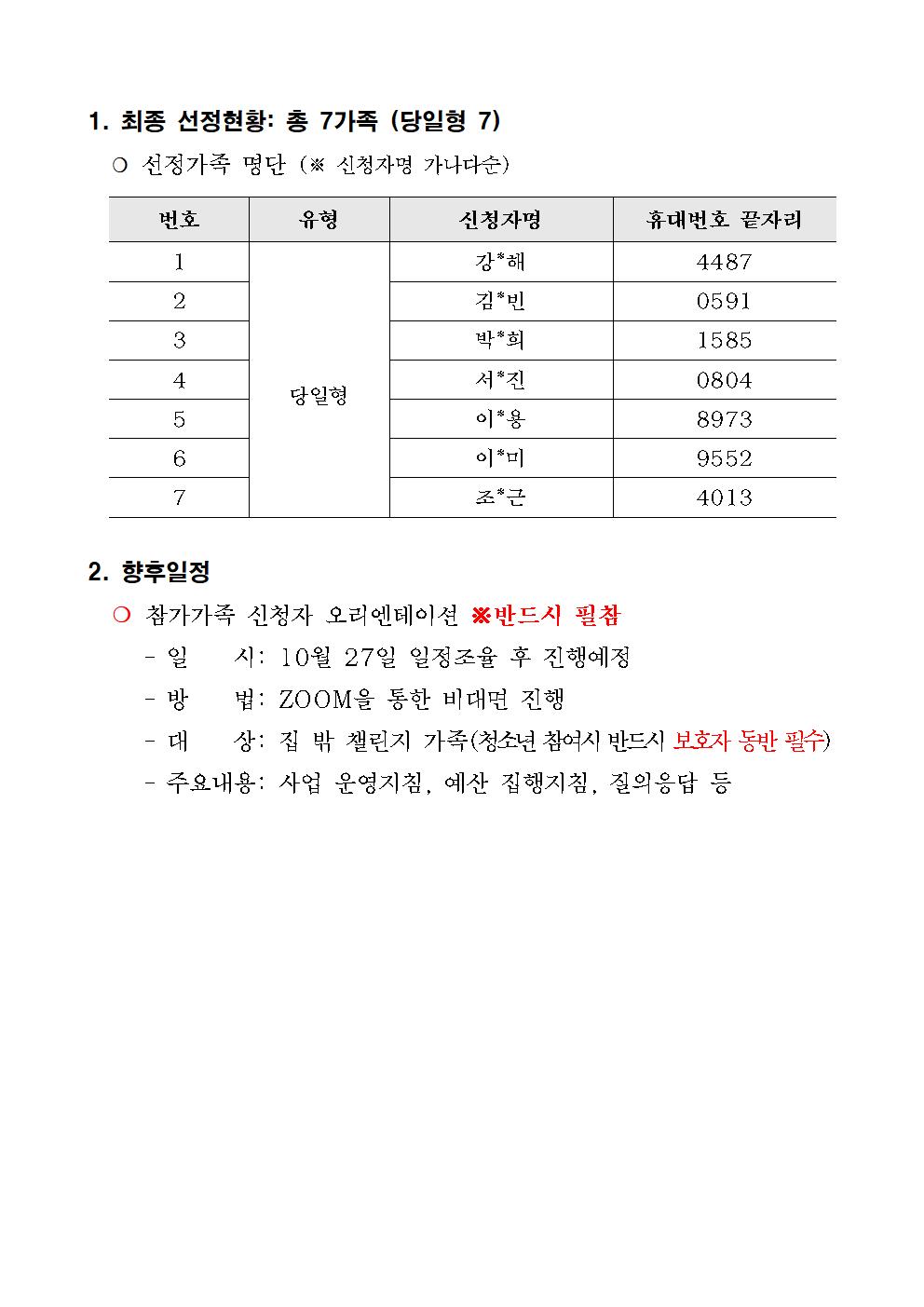 1. 개인정보의 이용 목적 : 학교 밖 청소년 지원 서비스 안내, 사업실적보고, 만족도조사