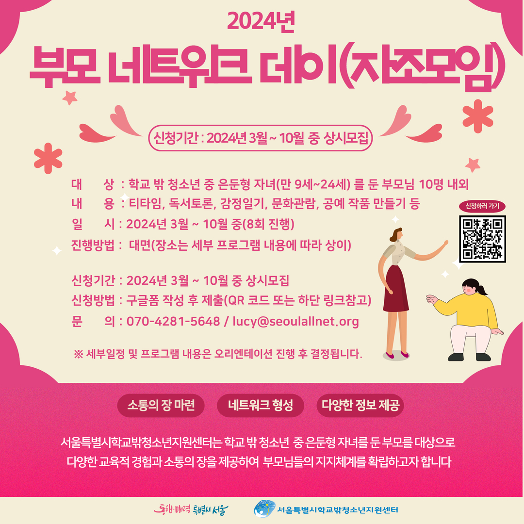 학교 밖 청소년 부모의 지지체계를 확립하고자 월 1회 정기적인 네트워크 자조모임 모임을 마련하여 다양한 정보와 소통의 장을 제공하고자 합니다.