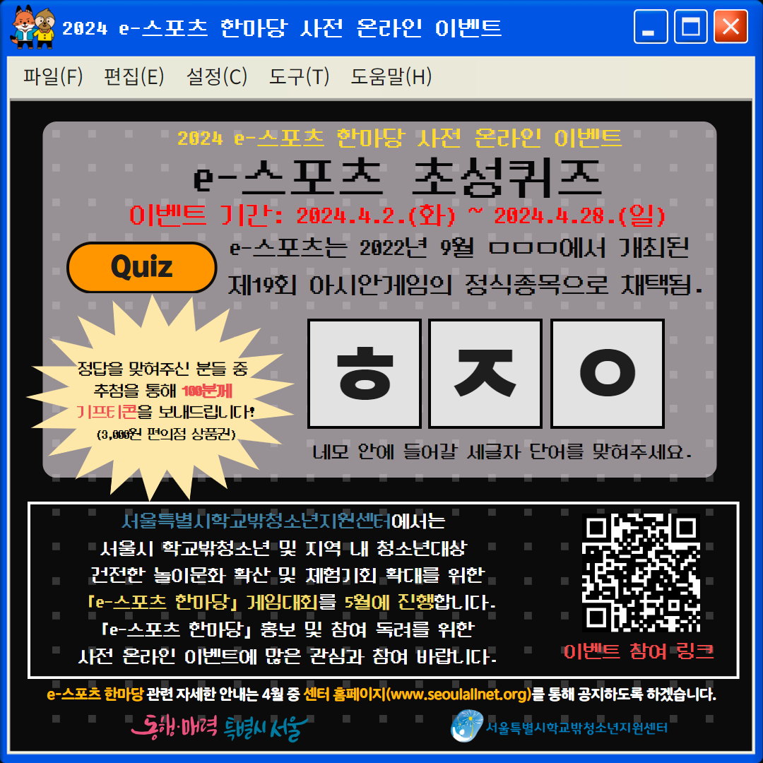 「e스포츠 초성퀴즈」를 통해 e-스포츠 관심 바랍니다.