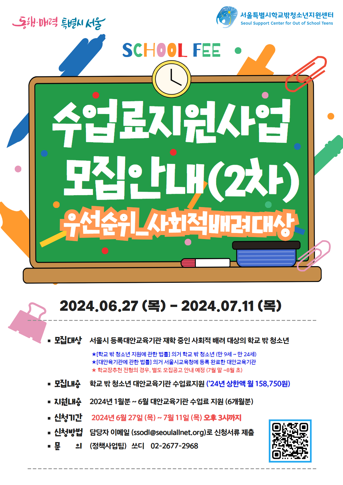 첨부파일 붙임1. (공고) 2024년 학교 밖 청소년 수업료 지원 모집 신청안내(2차_사회적배려대상).pdf
