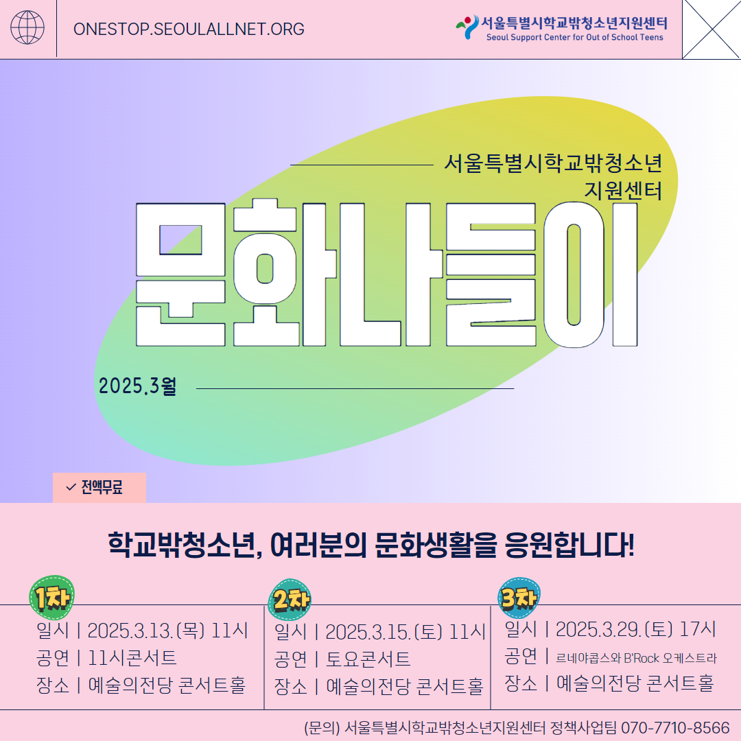 서울특별시학교밖청소년지원센터-예술의전당 3월 초청 공연은 총 3편이며, 초등학생 이상 연령 관람 가능합니다.