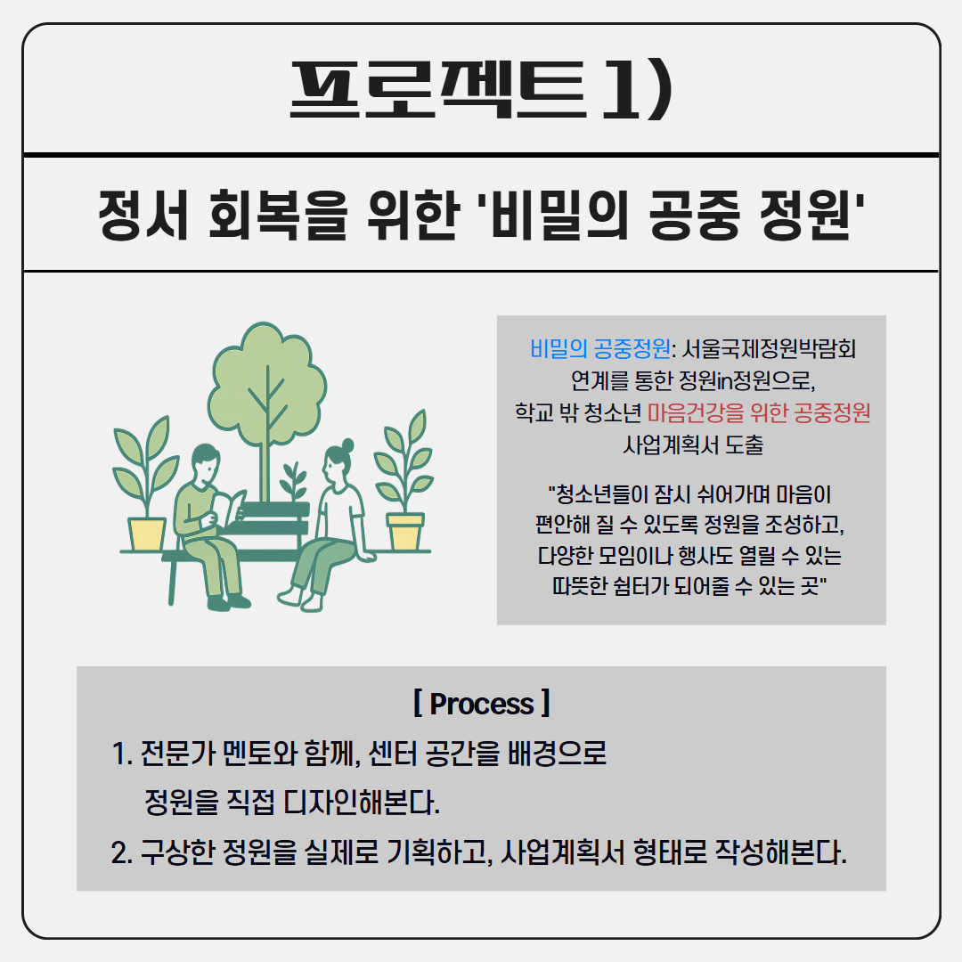 -서울국제정원박람회 연계를 통한 정원 in 정원으로, 학교밖청소년 마음 건강에 특화된 청소년이 기획한 비밀의 공중정원 사업계획서 도출